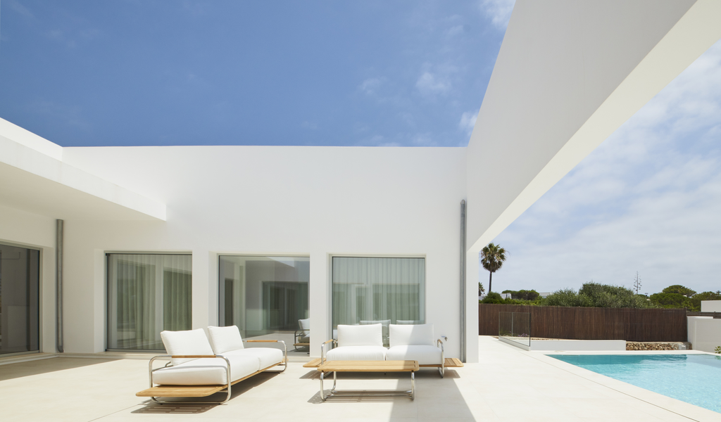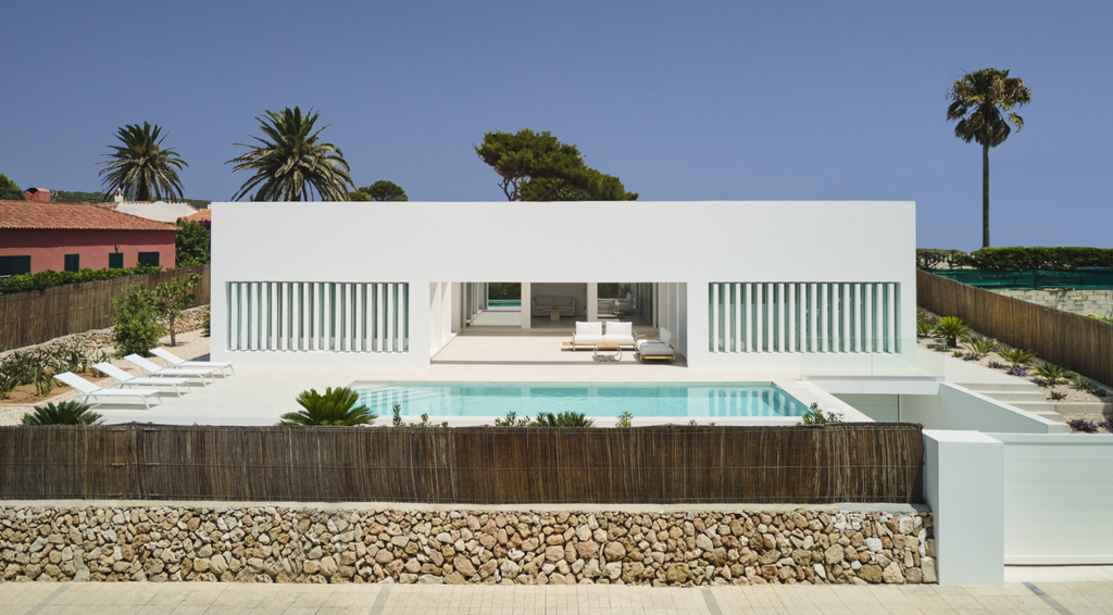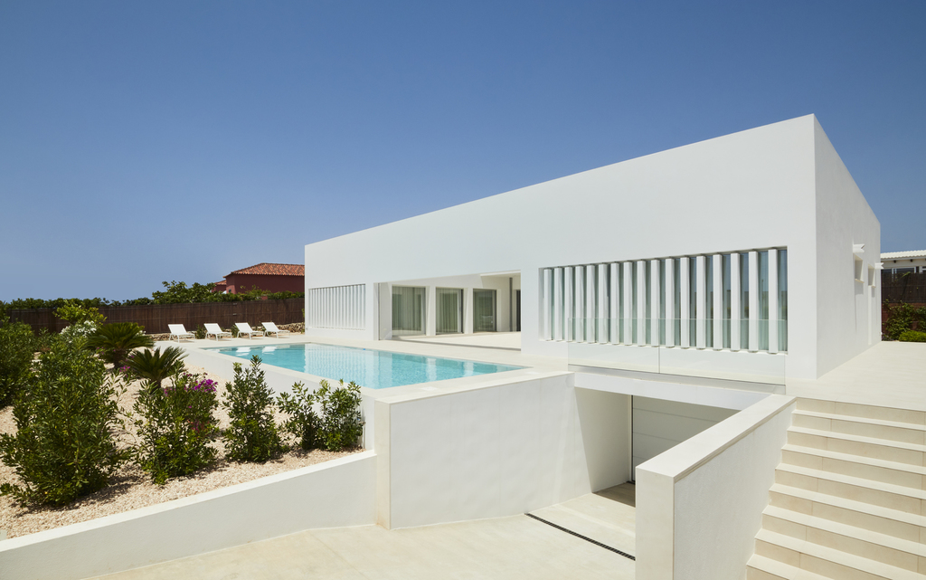 Esta discreta vivienda de lineas rectas, esconde en su interior algunos de los espacios más modernos y sorprendentes que puedan encontrar en la isla en estos momentos. Su propietario, un señor estranjero, quería un espacio donde en el que disfrutar todo el año del exterior, pero sin perder privacidad. Por lo que esta casa consigue el objetivo de ver sin ser visto. Además, la terraza que esconde la casa, permite integrar y ampliar el comedor con el exterior.