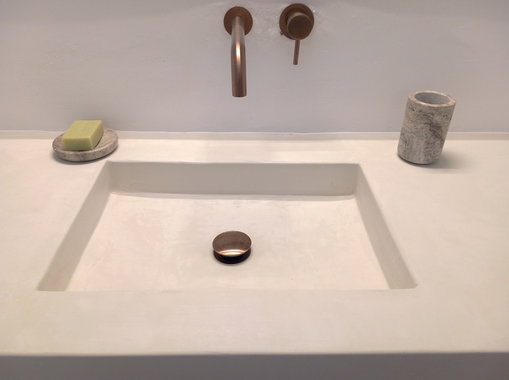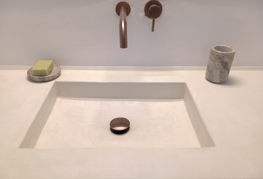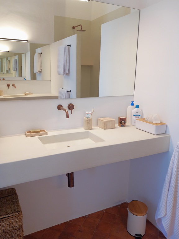 Este lavabo de obra, está construido en una única pieza, sin cortes, todo integrado desde la misma pared. En este baño se optó por poner grifos empotrados en la pared. Está acabado de